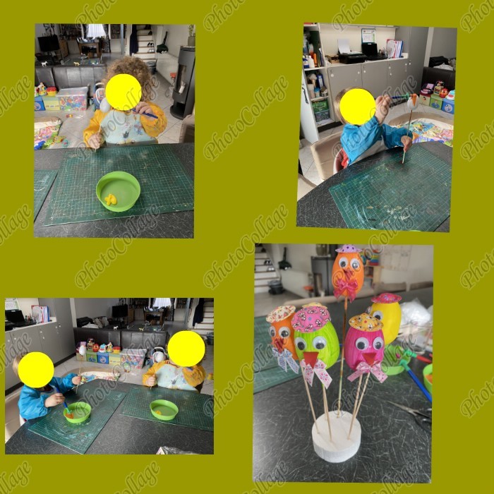 Ce matin, les loulous ont peint des œufs en polystyrène et y ont ajouté des yeux, un chapeau, un nœud et un bec et voilà le résultat !