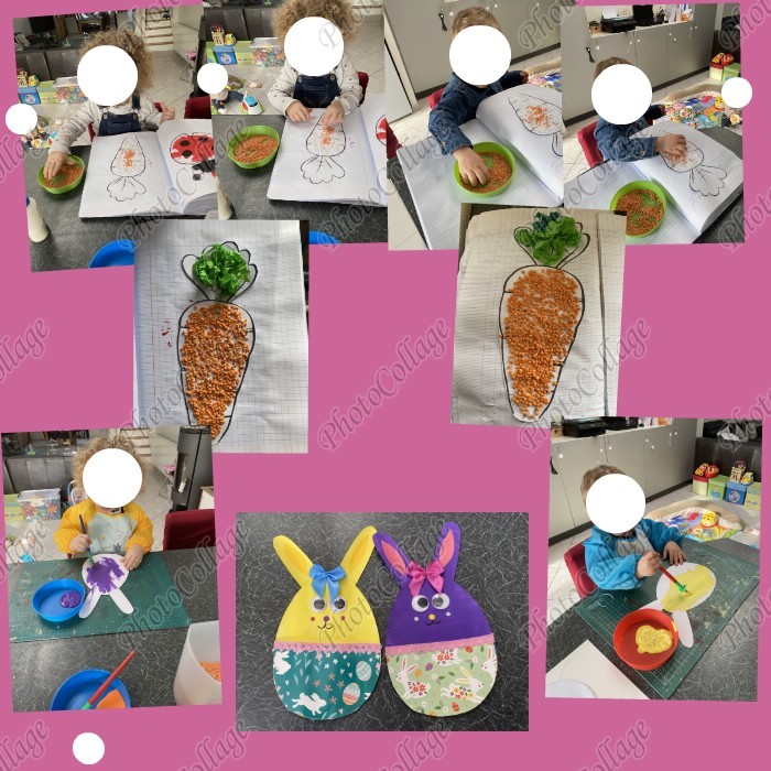 Ce matin, les loulous ont décoré une carotte avec des lentilles corail. Ensuite, ils ont fait des lapins en forme d'œufs ! (idée 10 doigts)