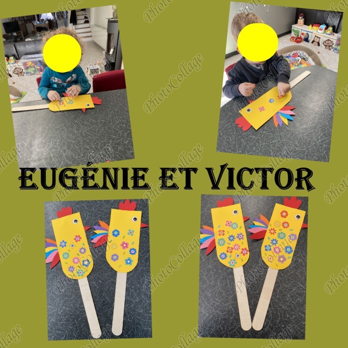 Ce matin, j'ai découpé deux formes dans des cartes fortes et les loulous les ont décoré pour faire de jolies poules ! (idée Pinterest)